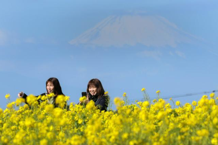 在傍晚時分,夕陽與富士山同框的美景更是吸引大量游客專程前往游覽拍照。據悉,當地油菜花的觀賞季可一直持續至3月上旬。