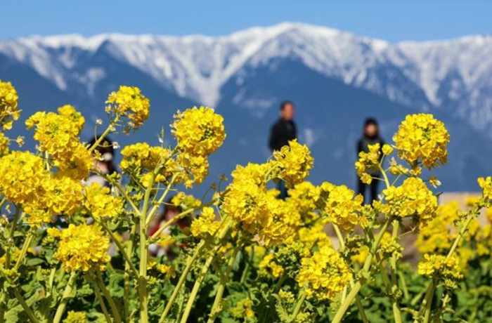 在日本滋賀縣守山市的琵琶湖畔,無數黃色花朵舒展身姿,隨風搖曳。今年,守山市第一海濱公園的油菜花比往年晚開了大約2個星期,如今已進入觀賞季。到訪游客還可以從這里觀賞到湖對岸的山頂積滿白雪的比良山脈,將初春獨有的美景盡收眼底。