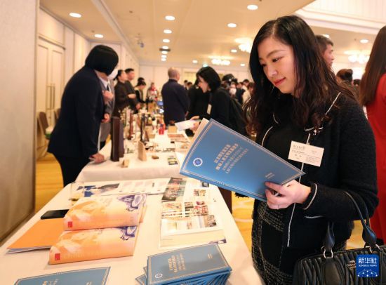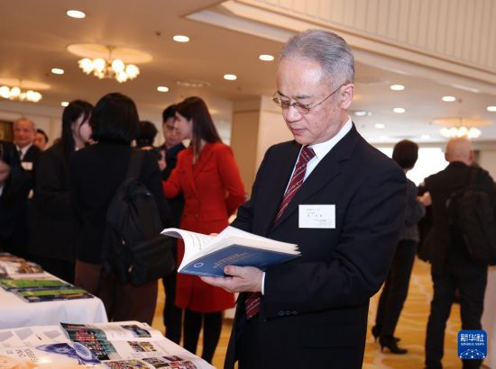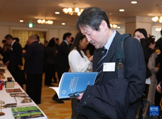 2月18日,在日本東京舉行的中日媒體智庫人文交流對話會上,與會嘉賓閱讀《以文明交流互鑒推動人類文明發展進步》智庫報告。新華社記者 賈浩成 攝