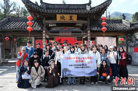 3月18日,“百名日本大學生看中國”活動走進安徽省黃山市,感知“徽文化”魅力。圖為日本學生們在呈坎古村景區拍照留念。傅天騁 攝