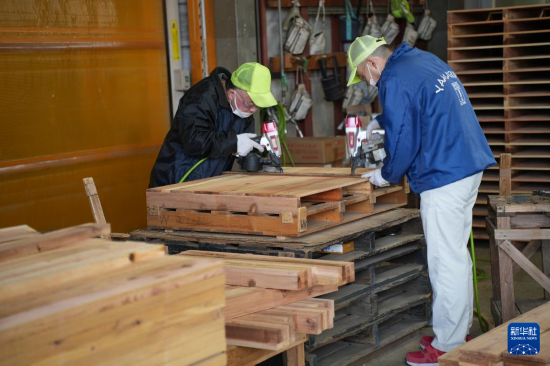3月13日,在日本埼玉縣川越市,孤獨癥人士在“山彥制作所”釘棧板。新華社記者 錢錚 攝