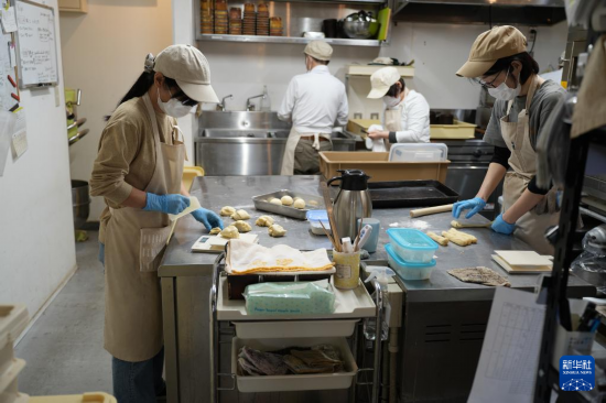 3月13日,在日本埼玉縣川越市,兩名孤獨癥人士(身穿白衣者)在烘焙坊協助烘焙師制作面包。新華社記者 錢錚 攝
