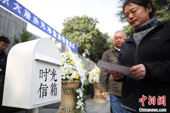 4月4日,南京大屠殺死難者遺屬代表將寫給遇難親人的信投入時光信箱。中新社記者 泱波 攝