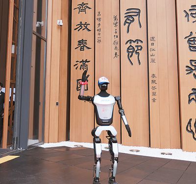 在日本大阪世博會,人形機器人在中國館外向嘉賓招手致意。新華社記者 賈浩成攝