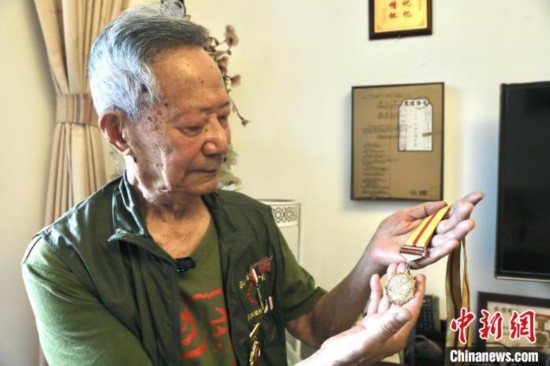 6日,王用勞展示紀念抗戰勝利的勛章?!∮浾?王磊 攝