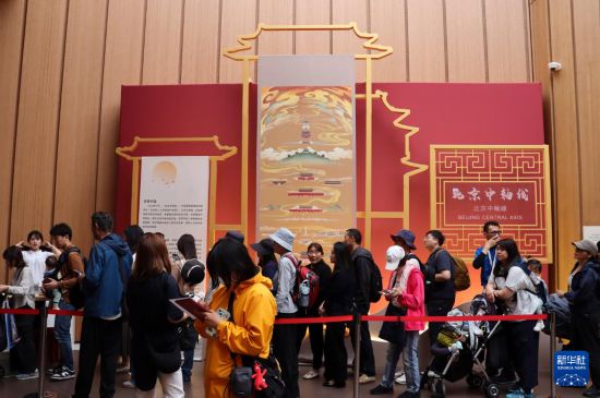 5月8日,觀眾在日本大阪世博會北京活動周現場的北京中軸線文化展區排隊打卡蓋章。新華社記者 胡曉格 攝