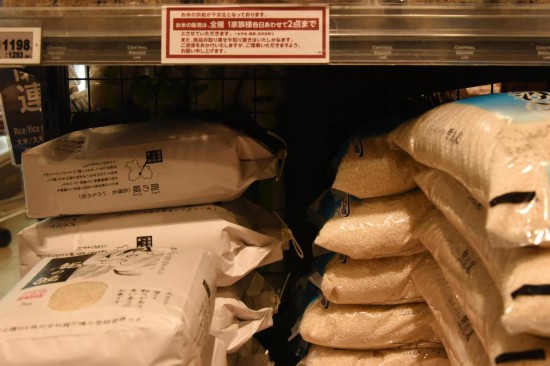5月21日,在日本東京一家超市,大米貨架上張貼著因供應不穩定實施限購的提示。新華社記者胡曉格攝