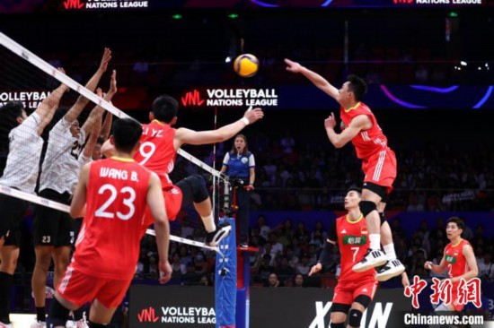 6月11日,2025世界男排聯賽(中國西安站)開賽。圖為中國男排(紅衣)進行網前進攻?!≈行律缬浾?張一辰 攝