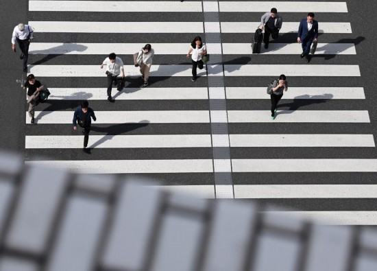5月15日,在日本東京,行人通過東京站附近的一處人行橫道。新華社記者賈浩成攝