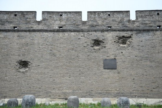 這是2024年7月4日拍攝的宛平城城墻上的彈坑遺跡。新華社記者 張晨霖 攝