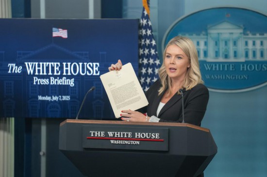 7月7日,在美國首都華盛頓白宮,白宮新聞發言人卡羅琳·萊維特在記者會上展示美國總統特朗普致日本首相的信函。新華社記者胡友松攝