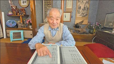 清水英男向記者介紹寫有自己名字的《731部隊留守名簿》。