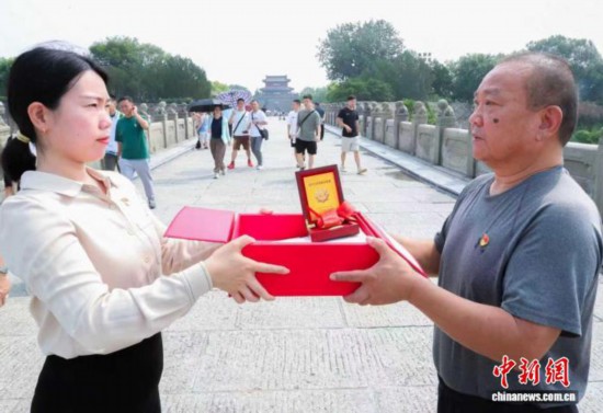 鄭然雙手接過紅匣,感受著其承載的分量,如同接過了一部沉甸甸的史書續篇。作為在宛平街道沸城社區工作多年的社區工作者,盧溝橋是她兒時的課堂,爺爺那蒼勁有力的講解聲是她最熟悉的聲音,早已將歷史的傷痛與民族的堅韌深深烙印在她心底。此刻,她感受到的是三代人守護民族記憶的熱忱與決心。