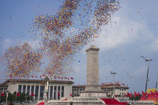 8萬羽和平鴿振翅飛翔,8萬只氣球騰空而起,飛過天安門城樓,飛越人民英雄紀念碑,飛向更高更遠的藍天。