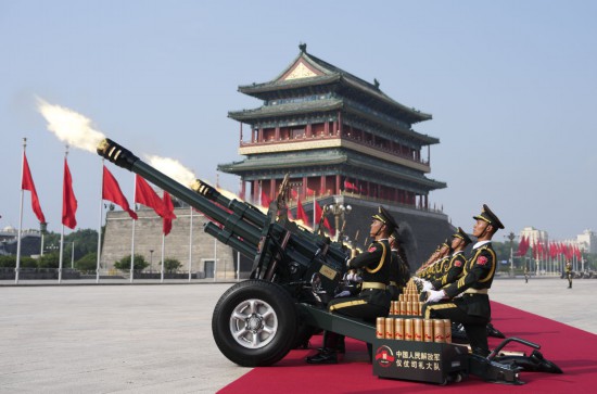 2025年9月3日,紀念中國人民抗日戰爭暨世界反法西斯戰爭勝利80周年大會在北京隆重舉行。這是禮炮在天安門廣場鳴響。新華社記者 牟宇 攝