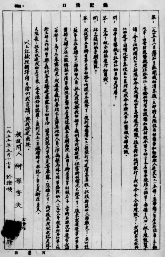 “我在1945年3月上旬,命令第一課長細矢少佐,將第一課所保存的傷寒菌、A型副傷寒菌各一試驗管,送交第731部隊第一部毒力檢定班,以便進行毒力檢查。因為這些細菌由于培養時間過長毒力會降低,需要檢查一下毒力,能否使用于細菌戰。我命令第一課長細矢少佐將兩只試驗管送交第731部隊第一毒力檢定班,以后在三月下旬,支隊的教育課長渡邊中尉為參加731部隊召開的教育系軍官會議,出差到第731部隊。渡邊中尉從731部隊回來后,向我作了報告。據他的報告,這兩只試驗管的細菌,以同731部隊標準毒力的一萬分之一PPM的濃度給人服用,有同樣使人發病的毒力,適合用于細菌戰。由于這個試驗管細菌的毒力檢定,殺害了中國愛國志士四名,我在這里認罪?!?/p>