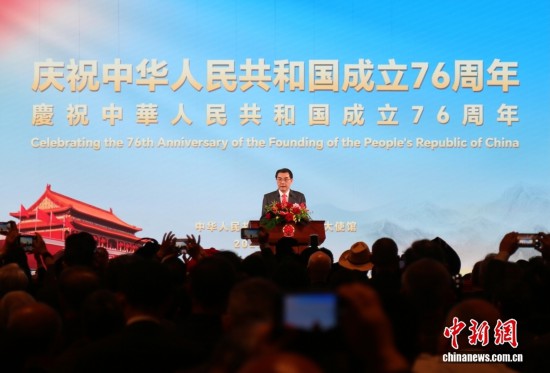 當地時間9月25日,中國駐日本大使館在東京新大谷飯店舉行慶祝中華人民共和國成立76周年招待會。圖為中國駐日本大使吳江浩致辭。
