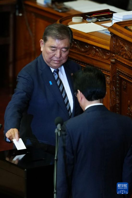 10月21日,在日本東京,前首相石破茂(左)參加臨時國會眾議院首相指名選舉投票。新華社記者 賈浩成 攝